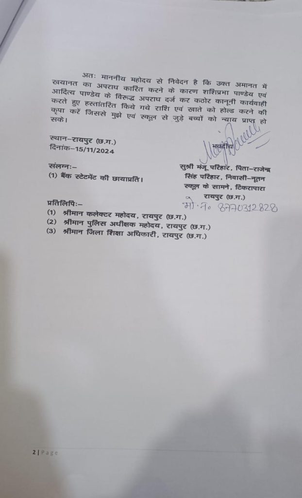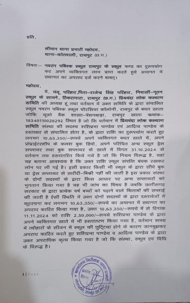 प्रतीक चौहान. रायपुर. राजधानी रायपुर के एक स्कूल में करीब 10 लाख रुपए गलत तरीके से ट्रांसफर किए जाने की शिकायत पुलिस के पास पहुंची है. इस मामले की शिकायत मंजू परिहार ने की है. पुलिस और कलेक्टर से की गई शिकायत में बताया गया है कि 10 लाख से अधिक की धनराशि स्कूल संपत्ति के अंतर्गत थी और इसे अनुचित तरीके से इस्तेमाल किया गया.