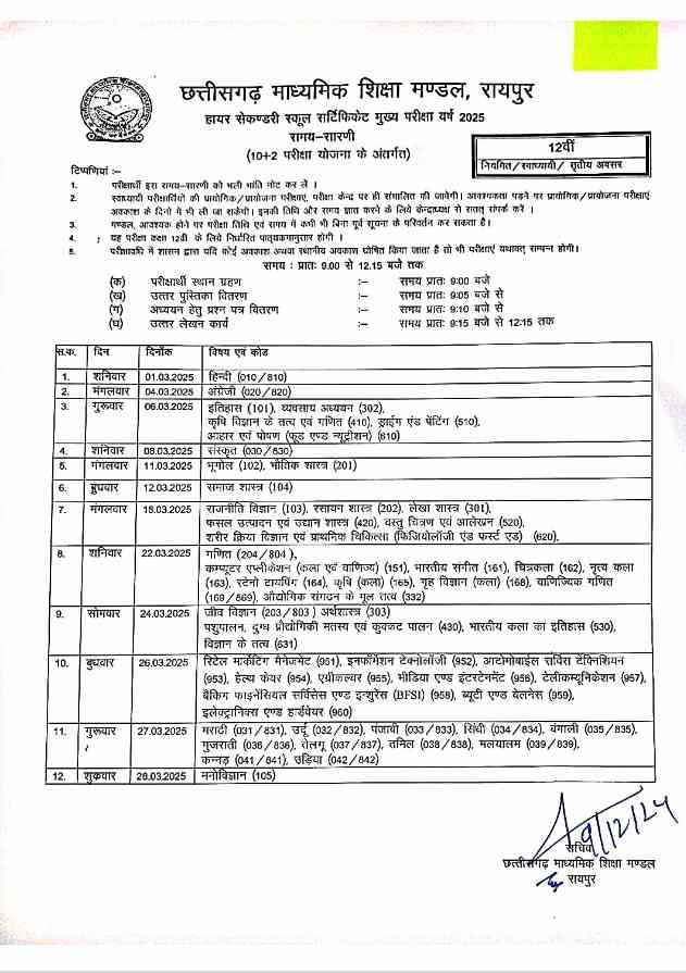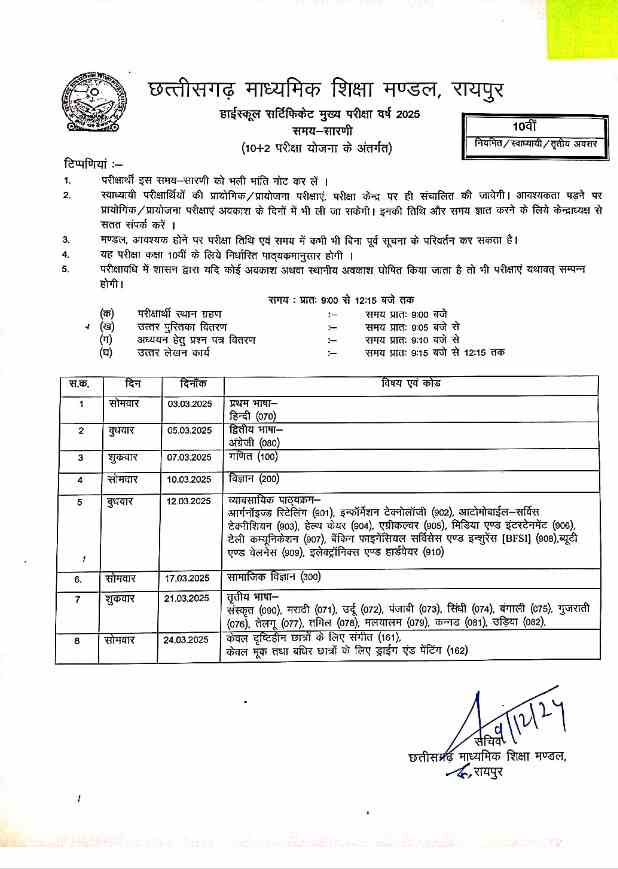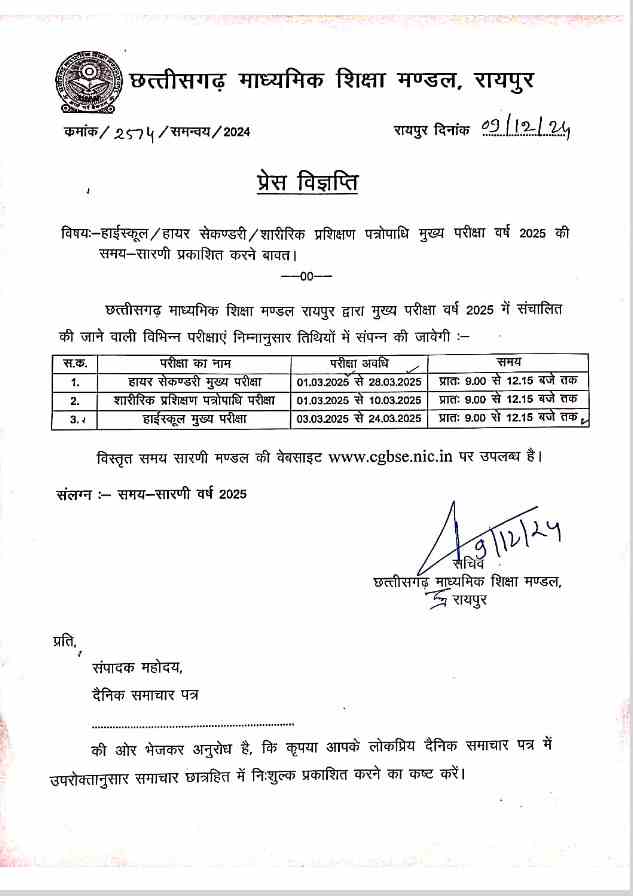रायपुर. छत्तीसगढ़ माध्यमिक शिक्षा मंडल ने हाईस्कूल, हायर सेकेंडरी मुख्य परीक्षा 2025 की समय सारणी जारी कर दी है. हायर सेकेंडरी की मुख्य परीक्षा 1 मार्च से 28 मार्च तक होगी. वहीं हाईस्कूल की बोर्ड परीक्षा 3 मार्च से 24 मार्च तक आयोजित होगी. दोनों परीक्षाएं सुबह की पाली में आयोजित की जाएगी.