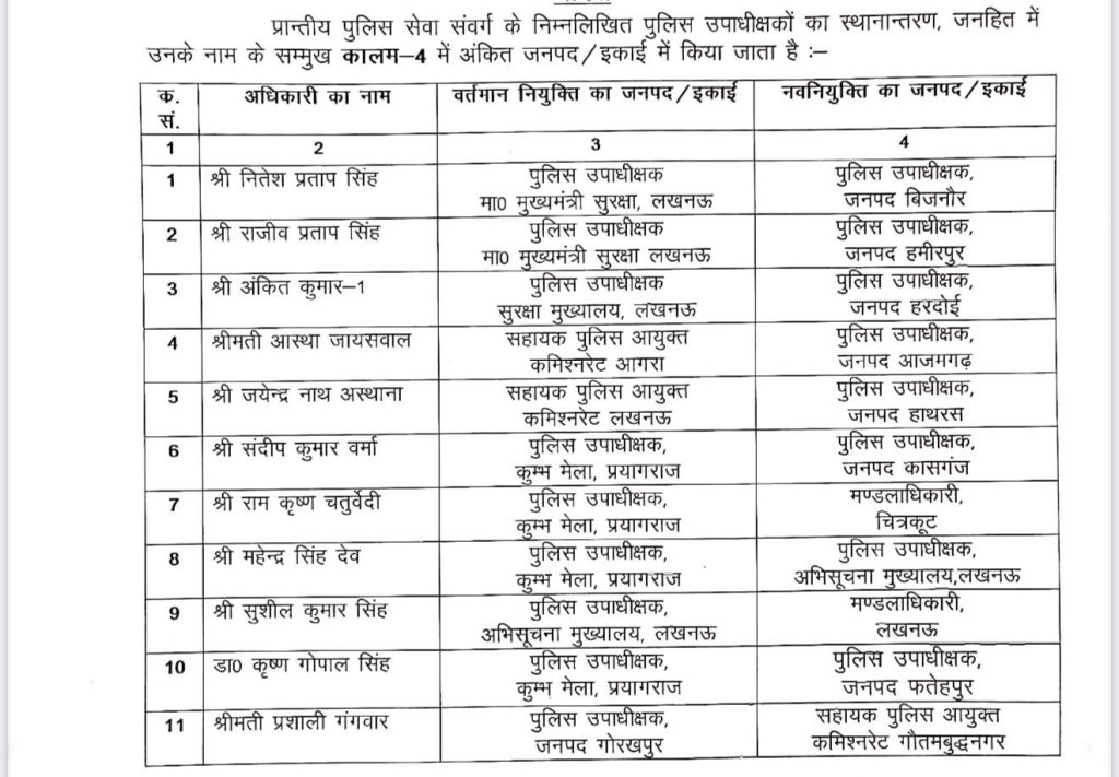 लखनऊ. उत्तर प्रदेश की योगी सरकार ने होली के ठीक बाद प्रदेश में तबादला एक्सप्रेस दौड़ा दी है. शासन ने 11 पीपीएस अफसरों का ट्रांसफर किया है. इसके अलावा 6 नए पीपीएस अधिकारियों को नई तैनाती दी गई है. इसमें पीपीएस अफसर नितेश प्रताप सिंह को पुलिस उपाधीक्षक मुख्‍यमंत्री सुरक्षा लखनऊ से पुलिस उपाधीक्षक बिजनौर बनाया गया है.
