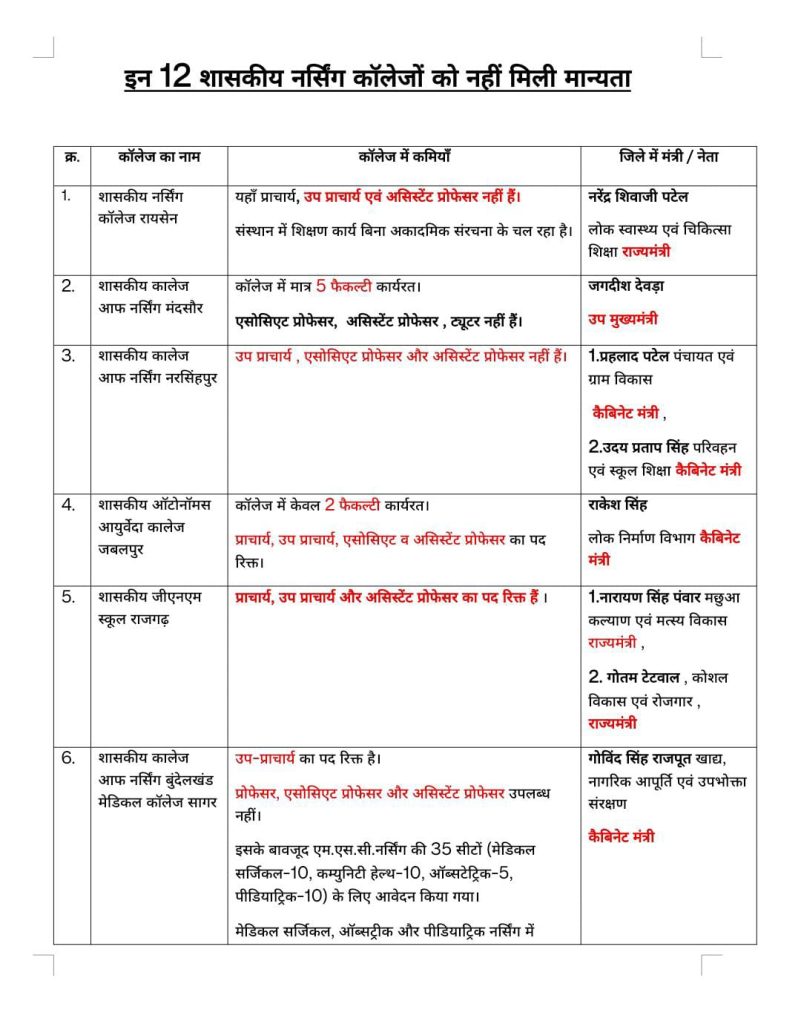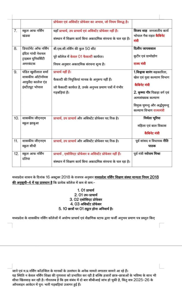 एनएसयूआई प्रदेश उपाध्यक्ष रवि परमार द्वारा अगस्त में 2025-26 सत्र की मान्यता के लिए किए गए आवेदनों के आधार पर 13 शासकीय नर्सिंग कॉलेजों की शिकायत की थी लेकिन उसके बावजूद भी इन कालेजों द्वारा कमियां पूरी नहीं की गई। अब स्थिति यह है कि मध्यप्रदेश सरकार के 13 में मंत्रियों और भाजपा के कई दिग्गज नेताओं के गृह जिले और अपने निर्वाचन क्षेत्र के शासकीय नर्सिंग कॉलेज बंद होने की कगार पर हैं। इनमें से कई कालेजों में प्राचार्य, उप प्राचार्य तक नहीं और कई में मात्र एक या दो फैकल्टी हैं।