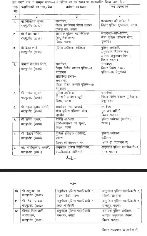 जारी नोटिफिकेशन के अनुसार कटिहार एसपी वैभव शर्मा को अपराध अनुसंधान विभाग पटना का एसपी बनाया गया है। वहीं पटना निगरानी अन्वेषण ब्यूरो के एसपी मनोज कुमार को बीएमपी 8 का समादेष्टा बनाया गया है।