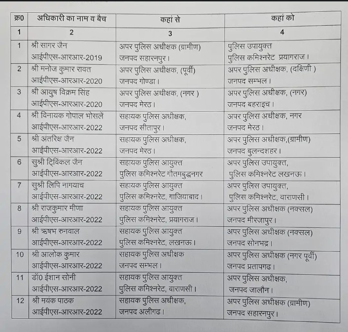 UP IPS TRANSFER: उत्तर प्रदेश में एक बार फिर तबादला एक्सप्रेस चली है। कानून व्यवस्था को दुरुस्त रखने के लिए योगी सरकार ने 12 आईपीएस अफसरों का ट्रांसफर किया है। जिसके मुताबिक आईपीएस-आरआर-2020 बैच के मनोज कुमार रावत को अपर पुलिस अधीक्षक (पूर्वी) गोंडा से अपर पुलिस अधीक्षक (दक्षिणी) सम्भल भेजा गया है। वहीं आईपीएस-आरआर-2019 बैच के सागर जैन को अपर पुलिस अधीक्षक (ग्रामीण) सहारनपुर से पुलिस उपायुक्त, पुलिस कमिश्नरेट प्रयागराज नियुक्त किया गया है।