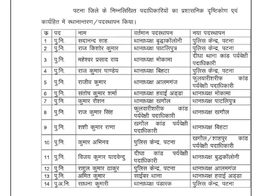 मोकामा थानेदार महेश्वर प्रसाद राय को हटाकर दीघा थाने में कांड पर्यवेक्षी पदाधिकारी बनाया गया है। हवाई अड्डा के थानेदार संतोष कुमार को मोकामा का थानेदार बनाया गया है। बिहटा थानेदार राजकुमार पांडेय को पुलिस केंद्र पटना बुला लिया गया है, जबकि शशि कुमार राणा को बिहटा का नया थानेदार बनाया गया है।