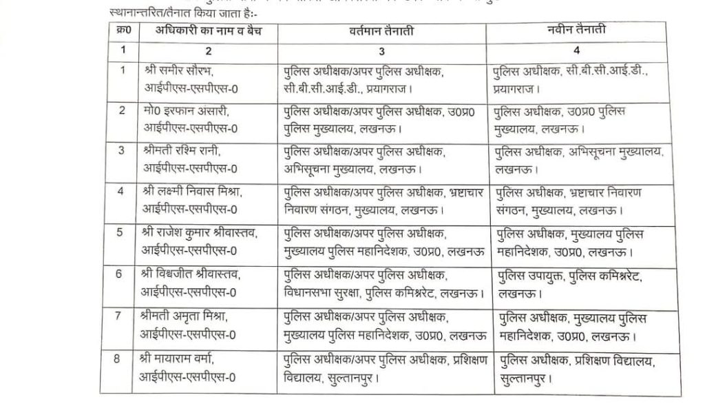 वहीं आईपीएस विश्वजीत श्रीवास्तव को पुलिस उपायुक्त पुलिस कमिश्नरेट, अमृता मिश्रा को पुलिस अधीक्षक पुलिस महानिदेशक लखनऊ, लक्ष्मी निवास मिश्रा को पुलिस अधीक्षक भ्रष्टाचार निवारण और मायाराम वर्मा को पुलिस अधीक्षक प्रशिक्षण विद्यालय सुल्तानपुर की जिम्मेंदारी दी गई है।