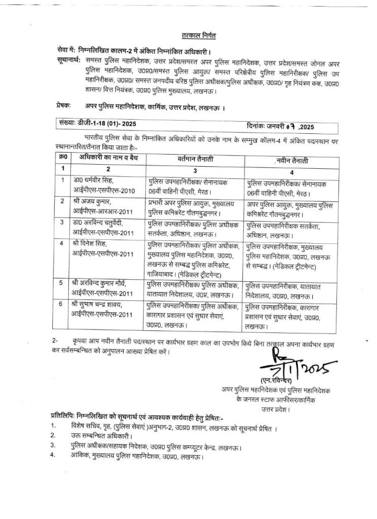 इसके अलावा दिनेश सिंह को DIG, पुलिस महानिदेशक लखनऊ से संबद्ध किया गया। अरविंद कुमार मौर्य को DIG यातायात निदेशालय लखनऊ बनाया गया है। जबकि सुभाष चन्द्र शाक्य को DIG कारागार प्रशासन एवं सुधार सेवा नियुक्त किया गया है। समीर सौरभ को पुलिस अधीक्षक सी.बी. सी. आई. डी प्रयागराज, मो. इरफान अंसारी को पुलिस अधीक्षक यूपी पुलिस मुख्यालय लखनऊ, रश्मि रानी को पुलिस अधीक्षक अभिसूचना मुख्यालय लखनऊ, राजेश कुमार श्रीवास्तव को पुलिस अधीक्षक, मुख्यालय महानिदेशक लखनऊ भेजा गया है।