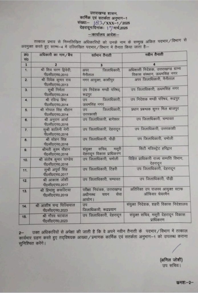 देहरादून. उत्तराखण्ड में पीसीएस अधिकारियों का तबादला किया गया है. उत्तराखंड शासन ने कार्मिक एवं सतर्कता अनुभाग ने अधिकारियों की सूची जारी की है. जिसके मुताबिक कुल 15 पीसीएस अफसरों को यहां से वहां किया गया है.