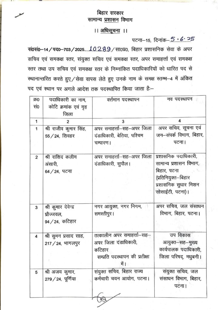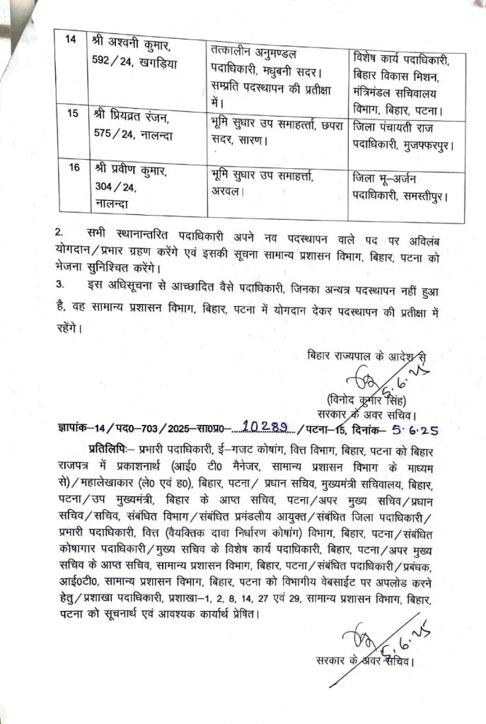 Bihar News: बिहार में आगामी विधानसभा चुनाव के मद्देनजर राज्य में अधिकारियों के तबादले का दौर जारी है. प्रदेश सरकार ने एक बार फिर बिहार प्रशासनिक सेवा के 16 अधिकारियों का तबादला कर दिया है. सामान्य प्रशासन विभाग ने तबादले की लिस्ट जारी कर दी है.