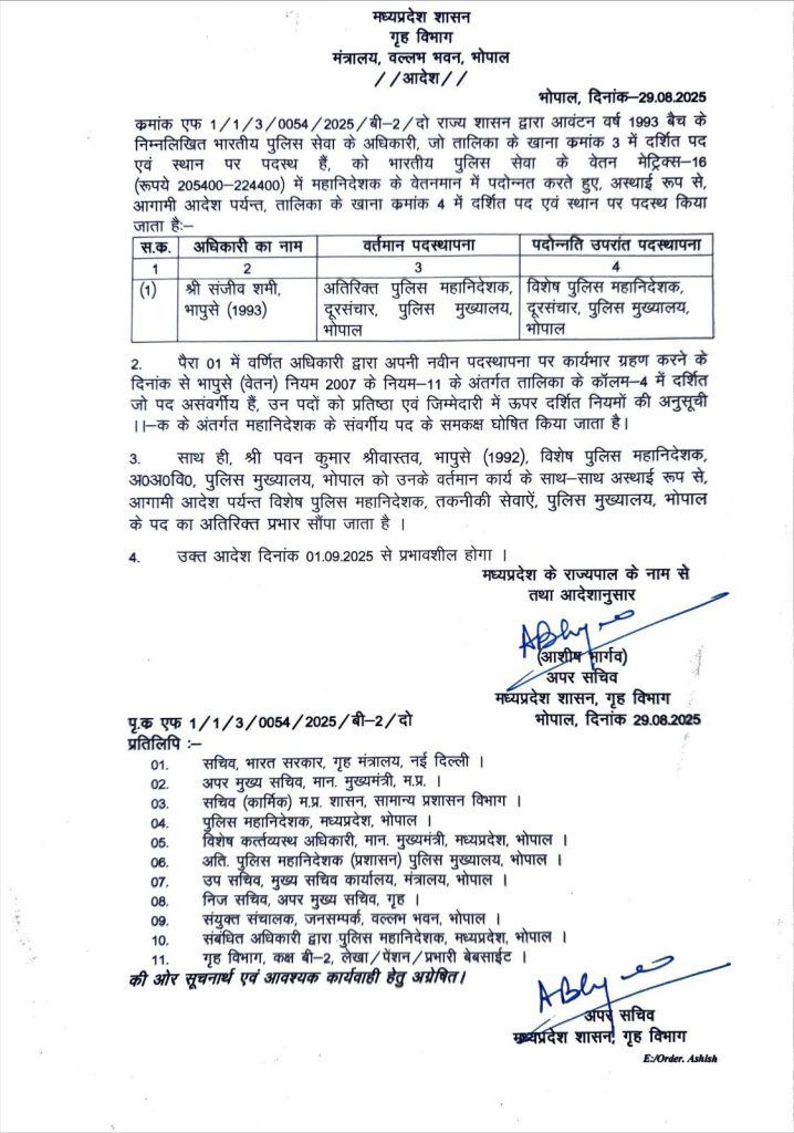 इसके साथ ही पवन कुमार श्रीवास्तव, विशेष पुलिस महानिदेशक, को उनके वर्तमान कार्य के साथ ही अस्थाई रूप से आगामी आदेश तक विशेष पुलिस महानिदेशक, तकनीकी सेवाएं, पुलिस मुख्यालय भोपाल के पद का अतिरिक्त प्रभार सौंपा गया है।