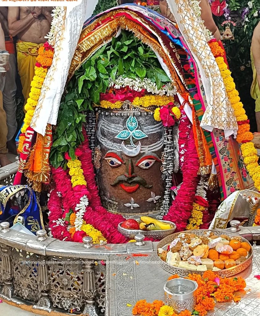 मंगलवार को भगवान महाकाल का त्रिपुंड चंद्र और बेलपत्र अर्पित कर दिव्य श्रृंगार किया गया। श्री महाकालेश्वर को भस्म चढ़ाई गई। साथ ही शेषनाग का रजत मुकुट, रजत की मुण्डमाल, रुद्राक्ष की माला के साथ सुगंधित पुष्प से बनी फूलों की माला धारण की। बाबा को फल और मिष्ठान का भोग लगाया गया। भोले बाबा का ड्रायफ्रूट से आकर्षक श्रृंगार किया गया।