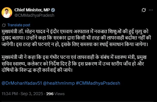 मुख्यमंत्री कार्यालय के सोशल मीडिया के जरिए जानकारी दी गई। एक्स पर लिखा, ‘मुख्यमंत्री डॉ. मोहन यादव ने इंदौर एमवाय अस्पताल में नवजात शिशुओं की हुई मृत्यु को दुखद बताया, उन्होंने कहा कि सरकार द्वारा किसी भी तरह की लापरवाही बर्दाश्त नहीं की जायेगी। इस तरह की घटनाएं न हो, इसके लिए समस्या का स्थाई समाधान किया जायेगा। मुख्यमंत्री ने कहा कि इस गंभीर घटना एवं लापरवाही के संबंध में स्वास्थ्य मंत्री, प्रमुख सचिव स्वास्थ्य, कलेक्टर को निर्देश दिए है कि इस प्रकरण में उच्च स्तरीय जांच हो और दोषियों के विरुद्ध कड़ी कार्रवाई की जाए।’