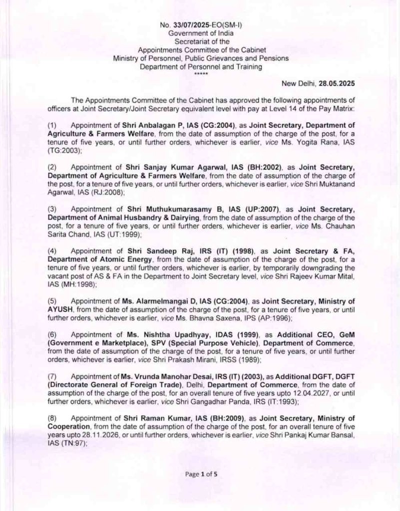 बता दें कि केंद्रीय मंत्रिमंडल की नियुक्ति समिति ने 41 आईएएस अफसरों की संयुक्त सचिव पद पर नियुक्तियों को मंजूरी दी है. आईएएस योगिता राणा के स्थान पर छत्तीसगढ़ कैडर के आईएएस अन्बलगन पी को कृषि एवं किसान कल्याण विभाग में संयुक्त सचिव के पद पर नियुक्त किया गया है. वहीं आईपीएस भावना सक्सेना के स्थान पर छत्तीसगढ़ कैडर के आईएएस अलरमेलमंगई डी को आयुष मंत्रालय में संयुक्त सचिव की जिम्मेदारी दी गई है.