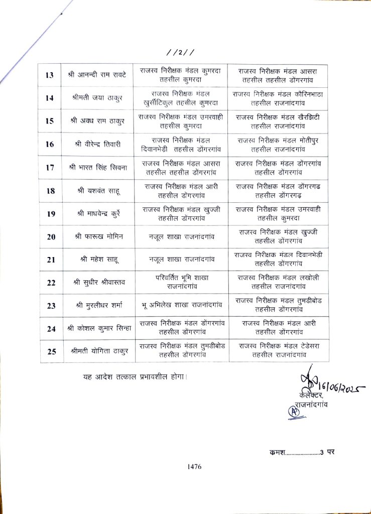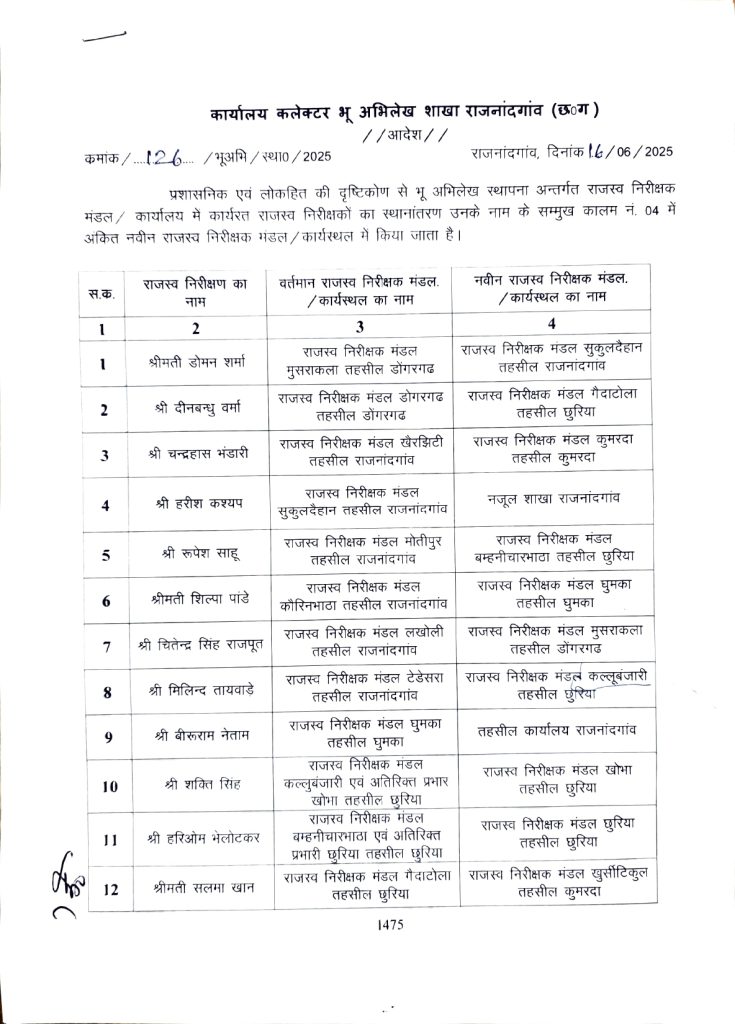 राजनांदगांव। जिले के राजस्व विभाग में एक बार फिर बड़ा फेरबदल किया गया है। कलेक्टर कार्यालय, भू-अभिलेख शाखा द्वारा जारी तबादले के आदेश में 25 राजस्व निरीक्षकों के स्थानांतरण का आदेश जारी किया गया है।