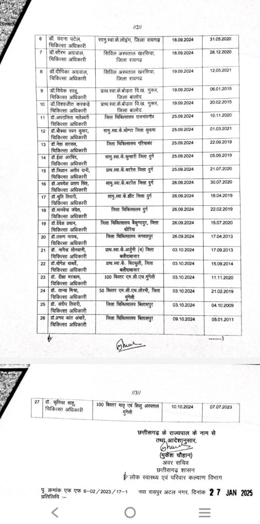 रायपुर। लंबे समय से अनाधिकृत रूप से अनुपस्थित 27 चिकित्सा अधिकारियों व विशेषज्ञ चिकित्सकों के खिलाफ कड़ी कार्रवाई करते हुए स्वास्थ्य एवं परिवार कल्याण विभाग ने उनकी सेवा समाप्त कर दी है. इसके साथ ही 21 चिकित्सा अधिकारियों के विरूद्ध विभागीय जांच के आदेश दिया गया है. यह भी पढ़ें : पूर्व सीएम भूपेश बघेल ने कहा – रायपुर में 15 साल तक हर वर्ग के लिए काम करने का मिलेगा फायदा, कांग्रेस में टिकट विवाद पर सिंहदेव बोले – नाराज नेताओं को मना लेंगे…