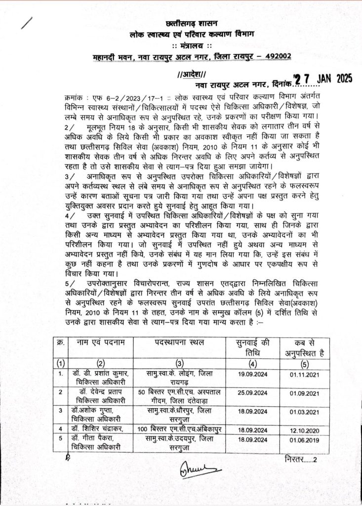 चिकित्सा अधिकारी और विशेषज्ञ चिकित्सक तीन वर्ष से अधिक अवधि के लिए अनाधिकृत रूप से अनुपस्थित रहते हुए शासन के मूलभूत नियम और छत्तीसगढ़ सिविल सेवा (अवकाश) नियम का उल्लंघन किया गया था. इस पर इन्हें कारण बताओ नोटिस जारी किया गया था.