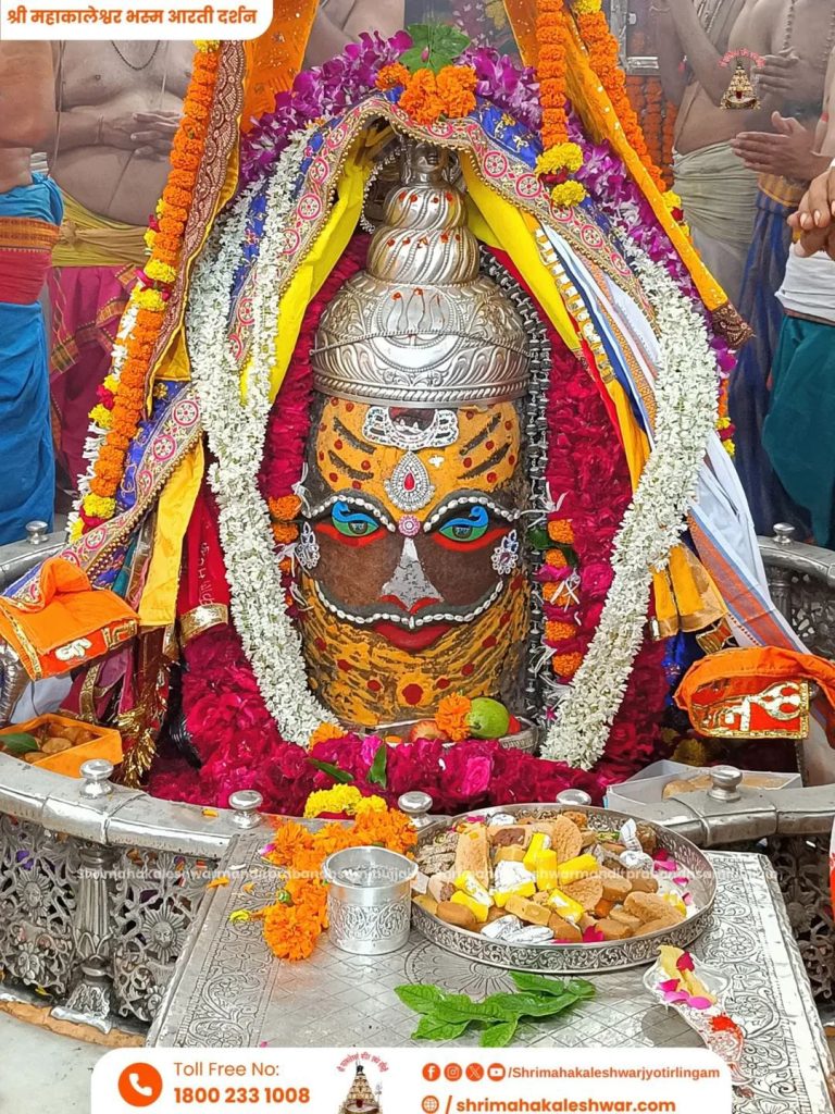 शनिवार को भगवान महाकाल का दिव्य श्रृंगार किया गया। मयूर की तरह आखें बनाई गईं जिसमें कृष्ण लिखा हुआ था। श्री महाकालेश्वर को भस्म चढ़ाई गई। साथ ही शेषनाग का रजत मुकुट, रजत की मुण्डमाल, रुद्राक्ष की माला के साथ सुगंधित पुष्प से बनी फूलों की माला धारण की। बाबा को फल और मिष्ठान का भोग लगाया गया। भोले बाबा का ड्रायफ्रूट से आकर्षक श्रृंगार किया गया।