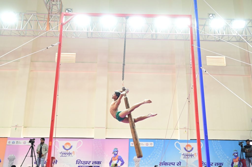 38th National Games. मुख्यमंत्री पुष्कर सिंह ने 38वें राष्ट्रीय खेल में वन चेतना केन्द्र, स्पोर्ट्स स्टेडियम, चकरपुर, खटीमा में मलखंब प्रतियोगिता का शुभारंभ किया. मुख्यमंत्री ने इस अवसर पर चकरपुर स्टेडियम में बॉक्सिंग छात्रावास बनाने की भी घोषणा की. मुख्यमंत्री ने 38वें राष्ट्रीय खेलों के अंतर्गत मलखंब प्रतियोगिता के शुभारंभ के अवसर पर देश के कोने-कोने से पधारे सभी प्रतिभागियों एवं खेल प्रेमियों का स्वागत करते हुए कहा कि चकरपुर के इस नवनिर्मित स्टेडियम में 38वें राष्ट्रीय खेलों के अंतर्गत आयोजित इस मलखंब प्रतियोगिता में सभी के बीच उपस्थित होकर उन्हें हर्ष की अनुभूति हो रही है.