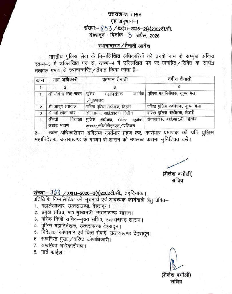 आदेश के मुताबिक योगेन्द्र सिंह रावत को कुंभ मेला के पुलिस महानिरीक्षक की जिम्मेदारी दी गई है. आयुष अग्रवाल को कुंभ मेला का वरिष्ठ पुलिस अधीक्षक बनाया गया है. श्वेता चौबे को टिहरी में वरिष्ठ पुलिस अधीक्षक की जिम्मेदारी सौंपी गई है. वहीं विशाखा अशोक भदाणे को सेनानायक, आईआरबी द्वितीय बनाया गया है.