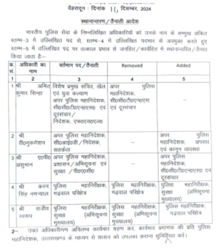 वहीं, करण सिंह नग्न्याल को डीजी सुरक्षा-सूचना मुख्यालय का जिम्मा सौंपा गया है. राजीव स्वरूप को आईजी गढ़वाल की जिम्मेदारी दी गई है.