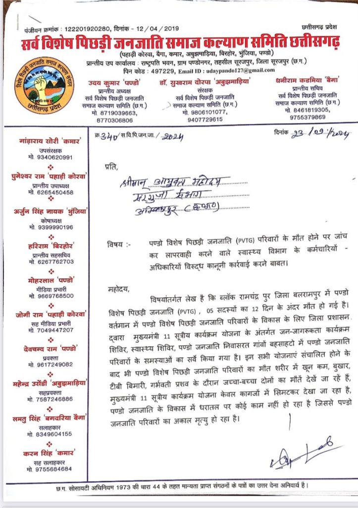 सर्व विशेष पिछड़ी जनजाति समाज कल्याण समिति के अध्यक्ष उदय पण्डो ने सरगुजा संभागायुक्त को लिखे पत्र में बलरामपुर जिला के रामचंद्रपुर ब्लॉक में 12 दिनों के अंदर पण्डो विशेष पिछड़ी जनजाति 5 सदस्यों की खून की कमी से मौत का जिक्र किया है. उन्होंने पण्डो विशेष पिछड़ी जनजाति परिवारों के विकास के लिए संचालित योजनाओं के केवल कागजों में सिमटे रहने का आरोप लगाते हुए कहा कि जनजाति के लोगों की खून कम, बुखार, टीबी के अलावा प्रसव के दौरान जच्चा-बच्चा की मौत हो रही है.