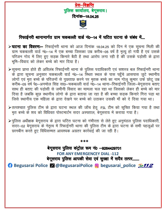 घटना पर डीएसपी रमेश प्रसाद सिंह, मुख्यालय बेगूसराय का बयान
