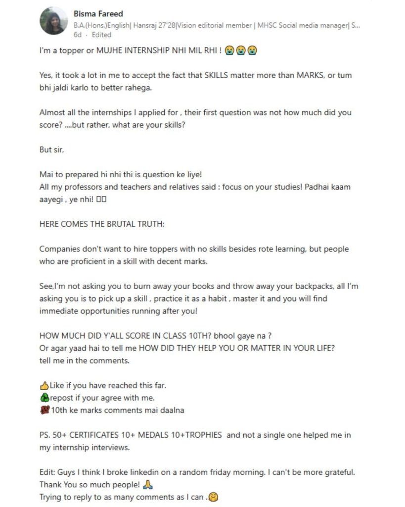 बिस्मा ने लिंक्डइन पर साझा करते हुए लिखा, “मैंने दिल्ली विश्वविद्यालय में शीर्ष स्थान प्राप्त किया है. मेरे पास विभिन्न क्षेत्रों में उत्कृष्टता के लिए 50 से अधिक प्रमाणपत्र हैं और मैंने विभिन्न प्रतियोगिताओं में 10 पदक भी जीते हैं, लेकिन नौकरी के बाजार में ये सभी सिर्फ कागज के टुकड़े बनकर रह गए. न तो नौकरी मिली और न ही इंटर्नशिप.” उनकी इस बात को पढ़कर हर उस व्यक्ति की धड़कनें तेज हो गईं, जिसने कभी इस स्थिति का सामना किया है. बिस्मा ने आगे कहा, “किताबों को जलाने की बजाय, एक कौशल चुनो और उसमें विशेषज्ञता हासिल करो, फिर देखो कि अवसर तुम्हारे पीछे दौड़ेंगे.”