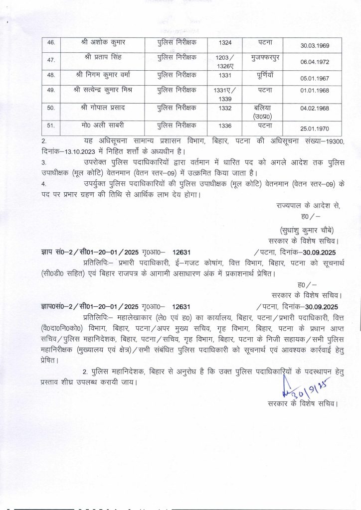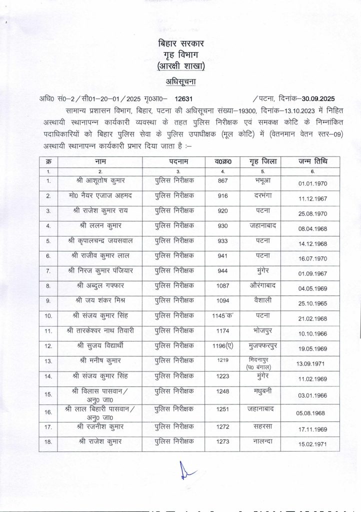 जारी अधिसूचना के अनुसार, 13 अक्टूबर 2023 से लागू अस्थायी स्थानापन्न कार्यकारी व्यवस्था के तहत पुलिस निरीक्षक और समकक्ष कोटि के अधिकारियों को बिहार पुलिस सेवा में पुलिस उपाधीक्षक (मूल कोटि) के रूप में अस्थायी कार्यभार सौंपा गया है। इन अधिकारियों का वेतनमान वेतन स्तर-09 के अनुसार निर्धारित किया गया है। अब इन 51 अधिकारियों की डीएसपी के पद पर पोस्टिंग का निर्णय राज्य सरकार करेगी। पुलिस विभाग ने बताया कि यह कदम अधिकारियों के करियर विकास के साथ-साथ विभागीय कार्यकुशलता बढ़ाने के उद्देश्य से उठाया गया है।