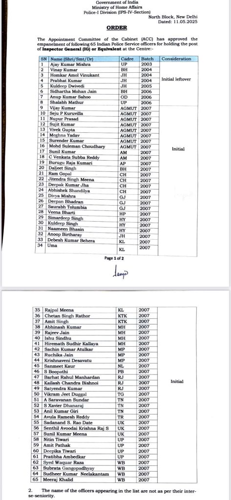 जारी आदेश में लिखा गया है कि ‘मंत्रिमंडल की नियुक्ति समिति (एसीसी) ने केंद्र में महानिरीक्षक (आईजी) या समकक्ष पद के लिए निम्नलिखित 65 भारतीय पुलिस सेवा अधिकारियों के पैनल को मंजूरी दे दी है’. सूची में यूपी से अजय कुमार मिश्रा, शलभ माथुर, नितिन तिवारी, अमित पाठक, दीपिका तिवारी और प्रतिभा अंबेडकर का नाम शामिल है.