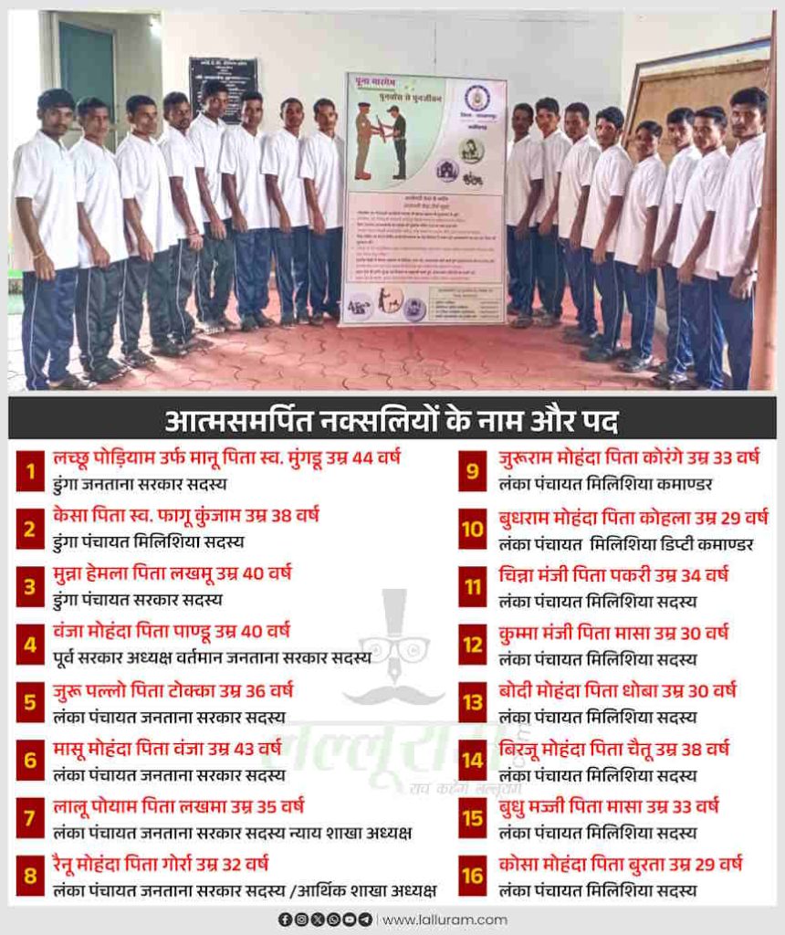 रायपुर। नक्सल उन्मूलन अभियान और अति संवेदनशील अंदरूनी क्षेत्रों में लगातार कैम्प स्थापित होने से पुलिस के बढ़ते प्रभाव व नक्सलियों के अमानवीय, आधारहीन विचारधारा एवं उनके शोषण, अत्याचार और भेदभाव से त्रस्त होकर घोर नक्सल प्रभावित लंका और डूंगा पंचायत में सक्रिय जनताना सरकार सदस्य (सीएनएम अध्यक्ष), पंचायत मिलिसिया डिप्टी कमांडर, पंचायत सरकार सदस्य, पंचायत मिलिसिया सदस्य और न्याय शाखा अध्यक्ष सहित 16 माओवादियों ने आत्मसमर्पण किया.