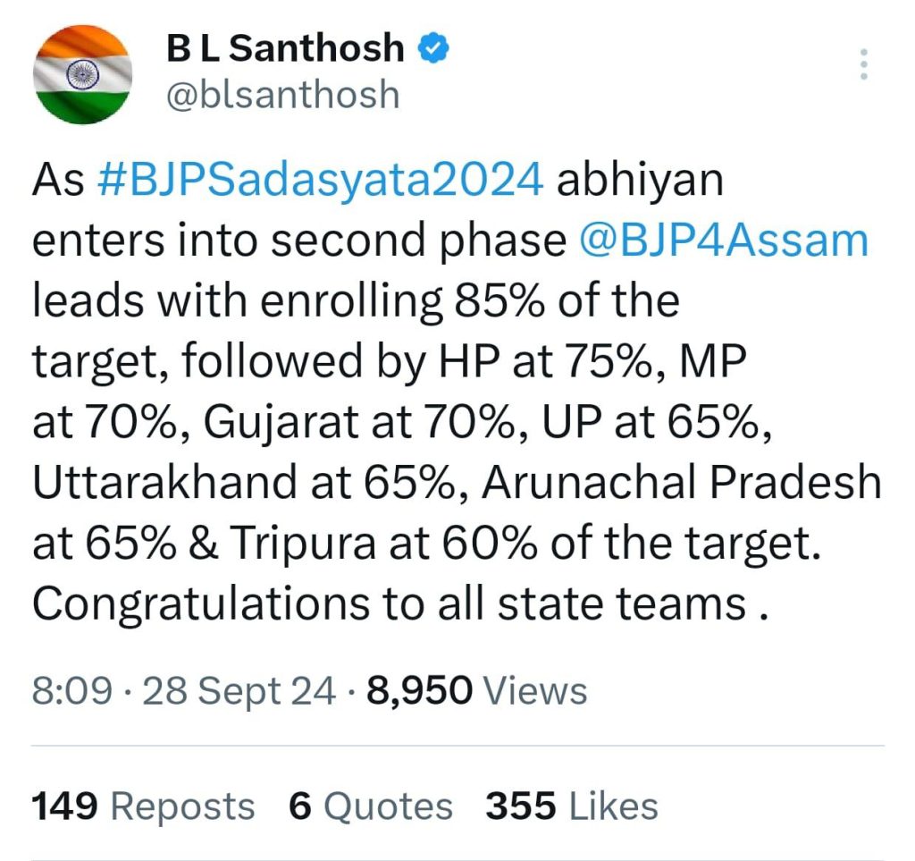 मुख्यमंत्री डॉ मोहन यादव ने सदस्यता अभियान को लेकर प्रसन्नता व्यक्त की। उन्होंने कहा कि लगातार अभियान जारी है। सभी मंत्री, विधायक, पार्षद, महापौर, पंचायत के प्रतिनिधि अभियान में जुटे हुए हैं। ऊपर से लेकर नीचे तक के कार्यकर्ता लक्ष्य प्राप्ति के लिए काम कर रहे हैं। मध्य प्रदेश में सदस्यता अभियान बहुत बढ़िया चल रहा है। आज हमने तय किया है कि आने वाली समय में भी सदस्यता के अभियान को सफल बनाएंग, हमारे लिए संकल्प की पूर्ति करेंगे। वहीं उन्होंने दशहरा शस्त्र पूजन से पहले सदस्यता अभियान का लक्ष्य हासिल करने के निर्देश दिए हैं।