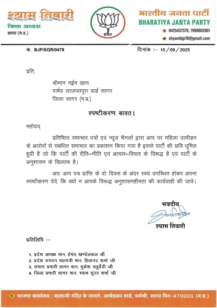 उमेश यादव, सागर। Sagar BJP councillor Naeem Khan: मध्य प्रदेश के सागर में युवती ने दो दिन पहले बीजेपी पार्षद नईम खान पर जबरन निकाह के दबाव का आरोप लगाया था। 25 साल की युवती ने 60 साल के पार्षद के खिलाफ कपड़े फाड़ने, बंधक बनाने और जबरन ले जाने की शिकायत की थी। जिसके बाद पार्टी ने उन्हें कारण बताओ नोटिस जारी किया था। इस मामले पर उन्होंने जवाब देते हुए पीड़िता को अपनी पत्नी बताया। वहीं लोग उस वक्त हैरान हो गए जब वही लड़की उनकी गाड़ी में बैठकर आराम से घर निकल गई।
