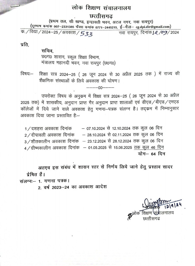 स्कूल शिक्षा विभाग, मंत्रालय महानदी भवन नवा रायपुर ने शिक्षा सत्र 2024-25 (26 जून 2024 से 30 अप्रैल 2025) के लिए राज्य की शैक्षणिक संस्थाओं के लिए अवकाश की घोषण की है।