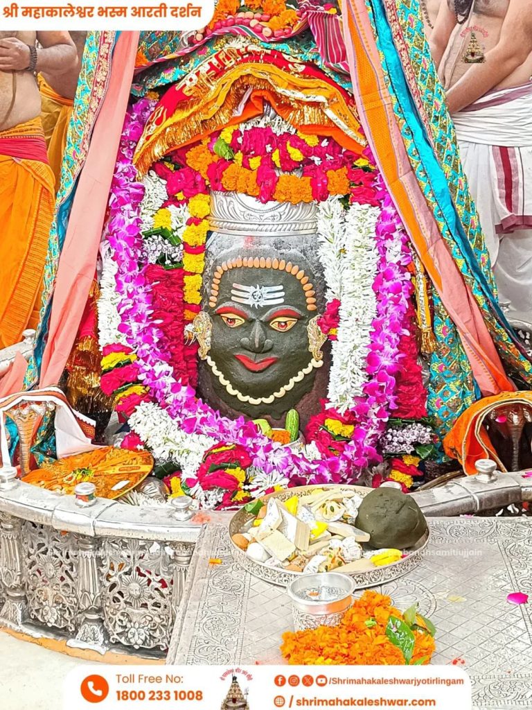 बुधवार को भगवान महाकाल का दिव्य श्रृंगार किया गया। श्री महाकालेश्वर को भस्म चढ़ाई गई। साथ ही शेषनाग का रजत मुकुट, रजत की मुण्डमाल, रुद्राक्ष की माला के साथ सुगंधित पुष्प से बनी फूलों की माला धारण की। बाबा को फल और मिष्ठान का भोग लगाया गया। भोले बाबा का ड्रायफ्रूट से आकर्षक श्रृंगार किया गया।