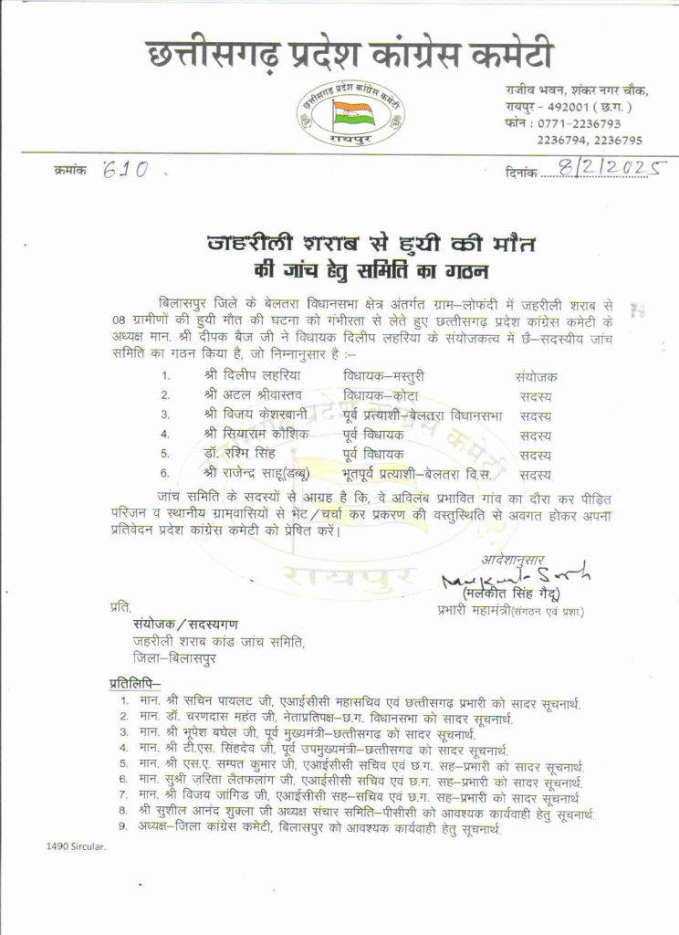 बिलासपुर। कोनी थाना क्षेत्र के लोफंदी में जहरीली महुआ शराब पीने से 7 लोगों की मौत से हड़कंप मच गया है। वहीं 4 लोगों की हालत गंभीर है, जिन्हें इलाज के लिए सिम्स में भर्ती कराया गया है। इस बीच प्रदेश कांग्रेस कमेटी (PCC) ने मामले में 6 सदस्यीय जांच समिति गठित की है, जो मौके पर जाकर पीड़ित परिवारों से मुलाकात करेगी।
