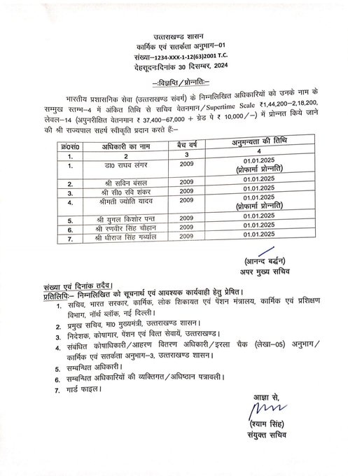 जारी आदेश के मुताबिक डॉ. राघव लंगर, सविन बंसल, सी. रवि शंकर, ज्योति यादव, युगल किशोर पंत, रणवीर सिंह चौहन और धीराज सिंह गर्ब्याल को प्रोन्नति मिली है. इन सभी की अनुमान्यता तिथि 01 जनवरी 2025 है.