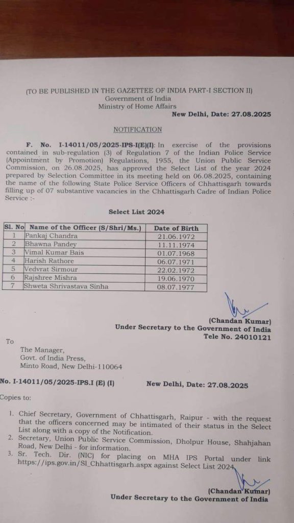 रायपुर। राज्य पुलिस सेवा के सात अधिकारियों को भारतीय पुलिस सेवा (आईपीएस) में पदोन्नति मिली है. इसका आदेश आज गृह मंत्रालय भारत सरकार ने जारी किया. आदेश में कहा गया है कि इन अधिकारियों को छत्तीसगढ़ कैडर में सात रिक्त पदों पर नियुक्त किया गया है.