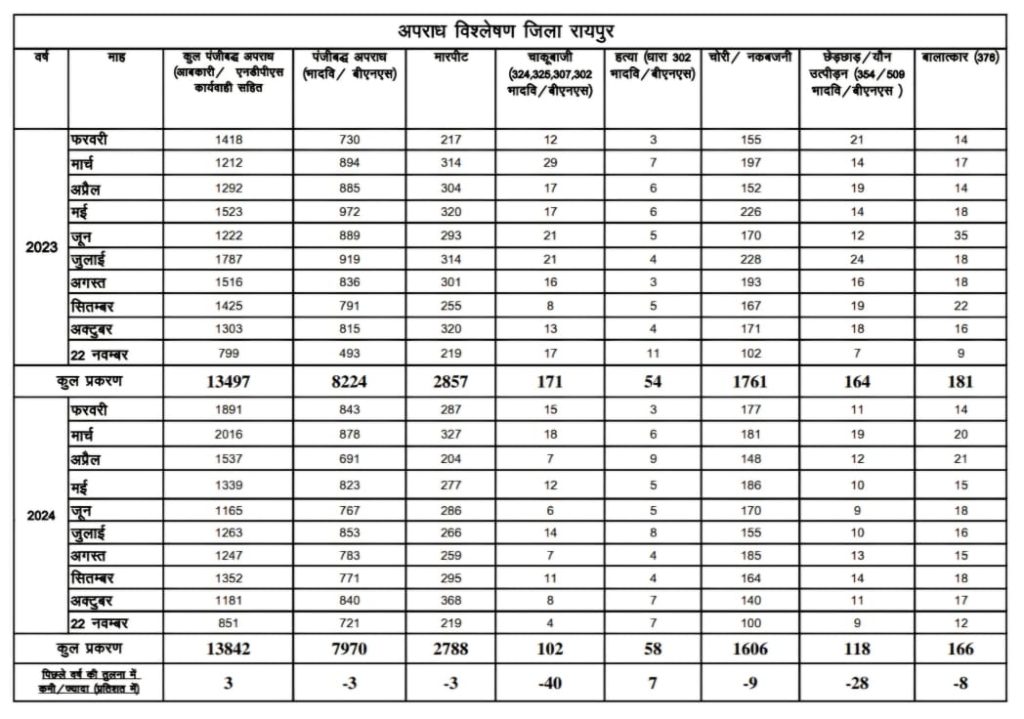 आईजीपी रायपुर अमरेश मिश्रा और एसएसपी संतोष सिंह के निर्देश पर जिलेभर में विशेष अभियान चलाए जा रहे हैं.जिला रायपुर में माह फरवरी से अब तक आईपीसी/बीएनएस के तहत 7970 अपराध दर्ज किए गए हैं. पिछले साल इसी अवधि में 8224 अपराध दर्ज हुए थे. इस तुलनात्मक अवधि में अपराधों में 3 प्रतिशत की आंशिक कमी आई है.