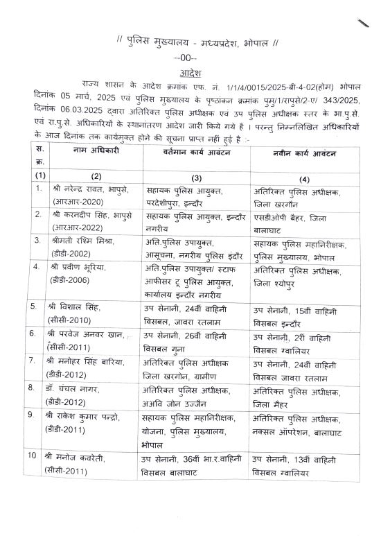 दरअसल, प्रदेश सरकार ने 6 मार्च को अतिरिक्त पुलिस अधीक्षक और उप पुलिस अधीक्षक स्तर के अफसरों का तबादला आदेश जारी किया था। उन्हें नई पदस्थापना वाली जगह निश्चित समयसीमा में ज्वाइन करने के आदेश दिए थे। इसके बाजवूद उन्होंने ज्वाइन नहीं की। इस पर राज्य शासन ने उन्हें कार्यमुक्त कर दिया।