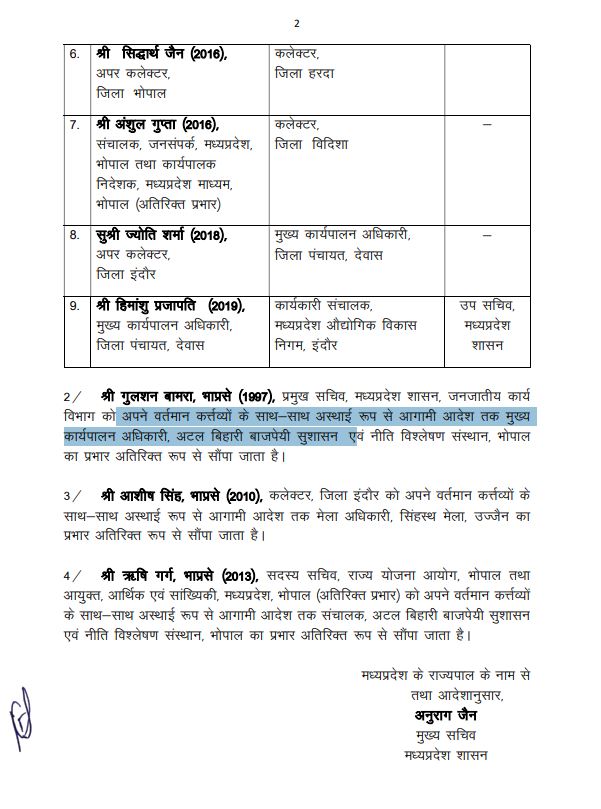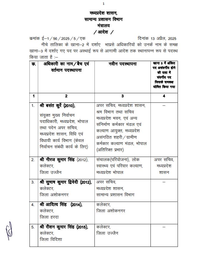 इसके अलावा संयुक्त मुख्य निर्वाचन पदाधिकारी बसंत कुर्रे को श्रम विभाग में अपर सचिव बनाया गया है। इंदौर कलेक्टर आशीष सिंह को मेला अधिकारी, सिंहस्थ मेला उज्जैन का अतिरिक्त प्रभार सौंपा गया है।