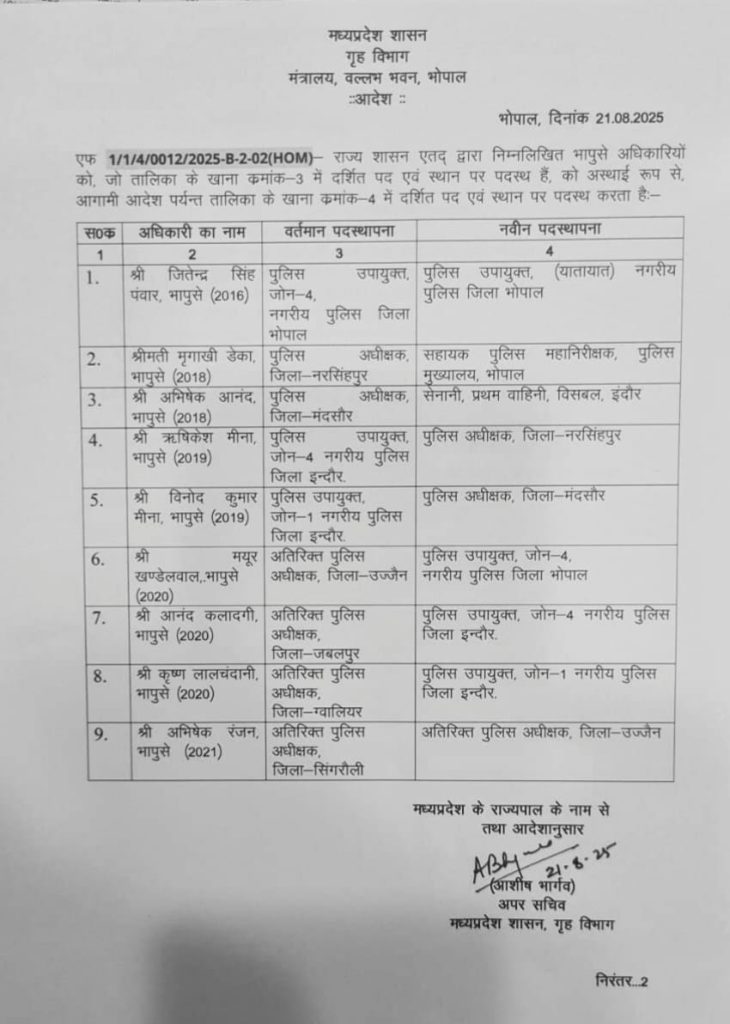 नरसिंहपुर SP रहीं मृगाखी डेका को AIG के पद पर पुलिस मुख्यालय में पदस्थ किया गया है। आनंद कलादगी को DCP जोन 4 इंदौर और IPS अभिषेक रंजन को एडिशनल SP उज्जैन की कमान सौंपी गई।