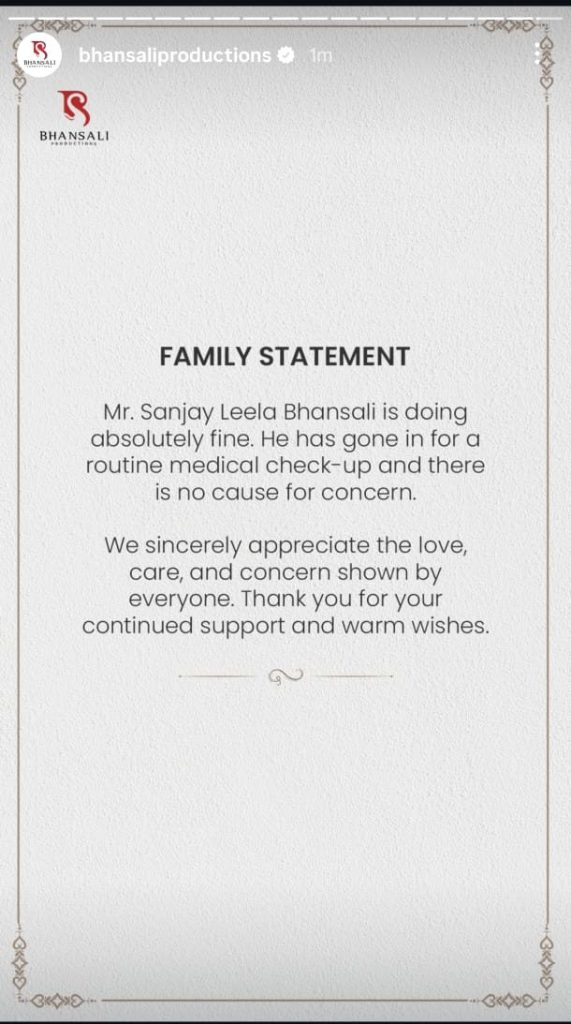 बता दें कि संजय लीला भंसाली (Sanjay Leela Bhansali) के परिवार ने इस खबर को झूठ बताते हुए अपना बयान शेयर किया है. परिवार की तरफ से जारा बयान में कहा गया कि- ‘संजय लीला भंसाली बिल्कुल स्वस्थ हैं. उन्होंने नियमित चिकित्सा जांच कराई है और चिंता की कोई बात नहीं है. आप सभी के स्नेह, देखभाल और चिंता के लिए हम तहे दिल से आभारी हैं. आपके निरंतर समर्थन और शुभकामनाओं के लिए धन्यवाद.’
