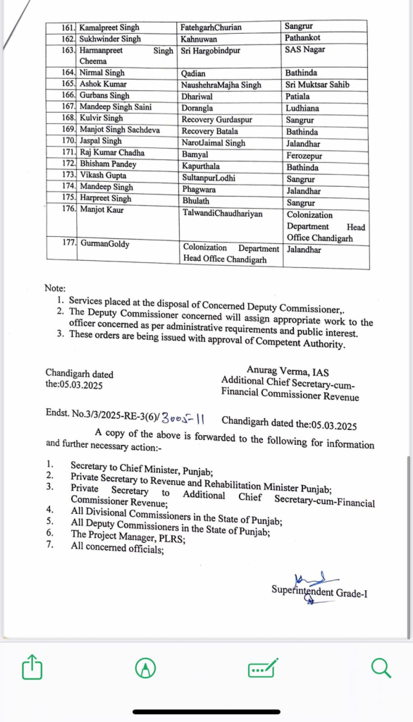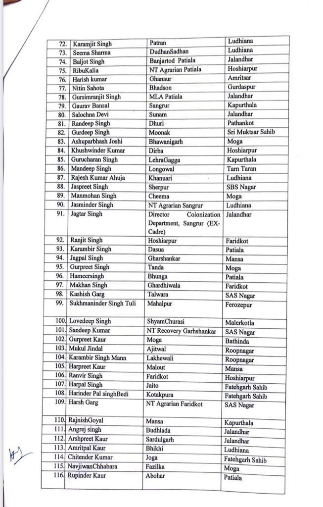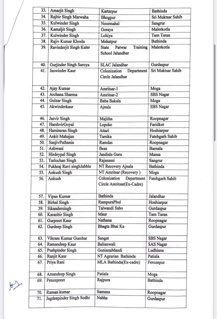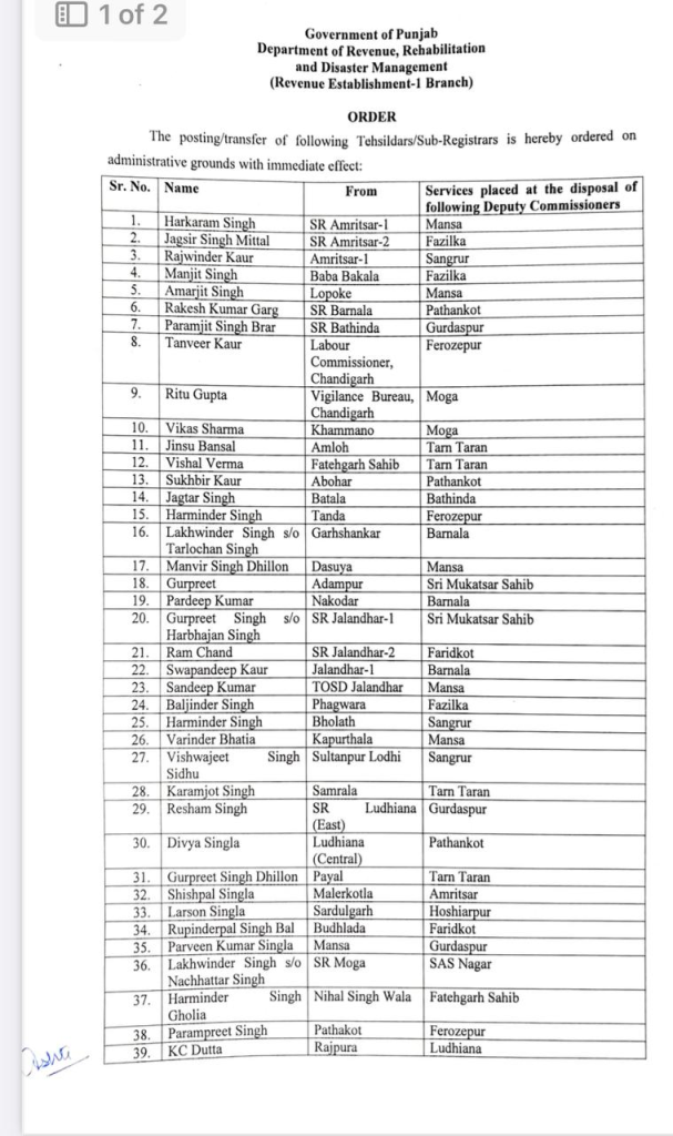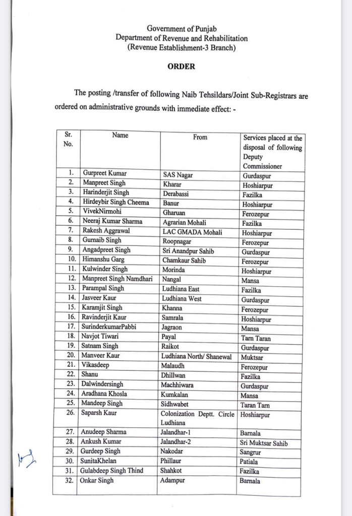 पंजाब से बड़ी खबर सामने आई है, जिसमें सरकार ने एक बार फिर से बड़ा फेरबदल किया है। 58 तहसीलदार और 177 नायब तहसीलदार का तबादला कर दिया है। अचानक तबादला किए जाने ने विभाग में हड़कंप मच गया है। इसके पहले हड़ताल पर बैठे तहसीलदारों पर गाज गिर चुकी है।