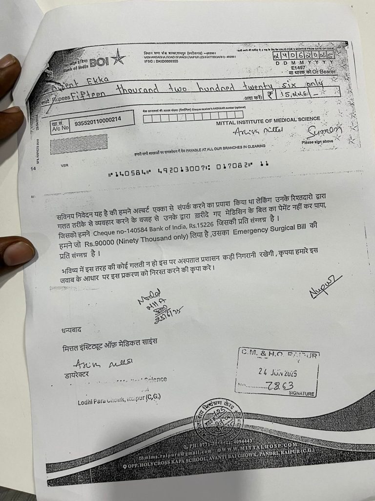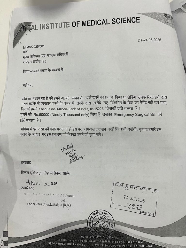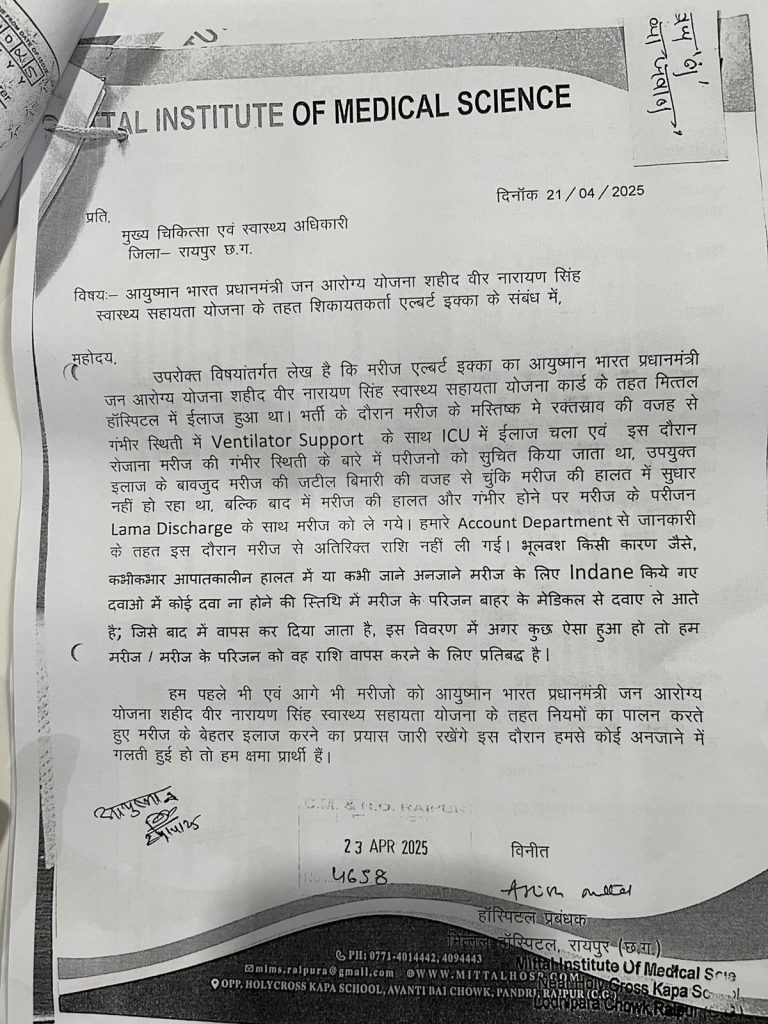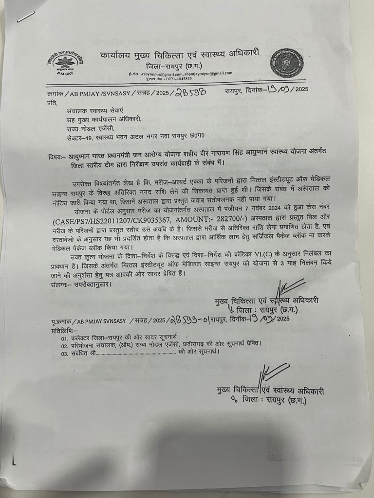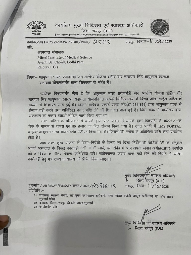 प्रतीक चौहान. रायपुर. राजधानी रायपुर के मित्तल हॉस्पिटल का चौंकाने वाला मामला सामने आया है. अस्पताल प्रबंधन पर जशपुर के रहने वाले मरीज (मृतक के) परिजनों ने आरोप लगाए हैं कि उन्होंने आयुष्मान कार्ड से करीब 3 लाख रूपए ब्लॉक किए और लगभग इतनी ही राशि (3 लाख) परिजनों से कैश में ले लिए, जिसका बिल भी परिजनों को नहीं दिया. अब इस मामले में सीएमओ से शिकायत के बाद सीएमओ कार्यालय ने संचालक स्वास्थ्य सेवाएं को पत्र लिखकर 3 महीने के लिए मित्तल इंस्टीट्यूट ऑफ मेडिकल साइन्स आयुष्मान योजना भारत प्रधानमंत्री जन आरोग्य योजना से निलंबन किए जाने की अनुशंसा की है.