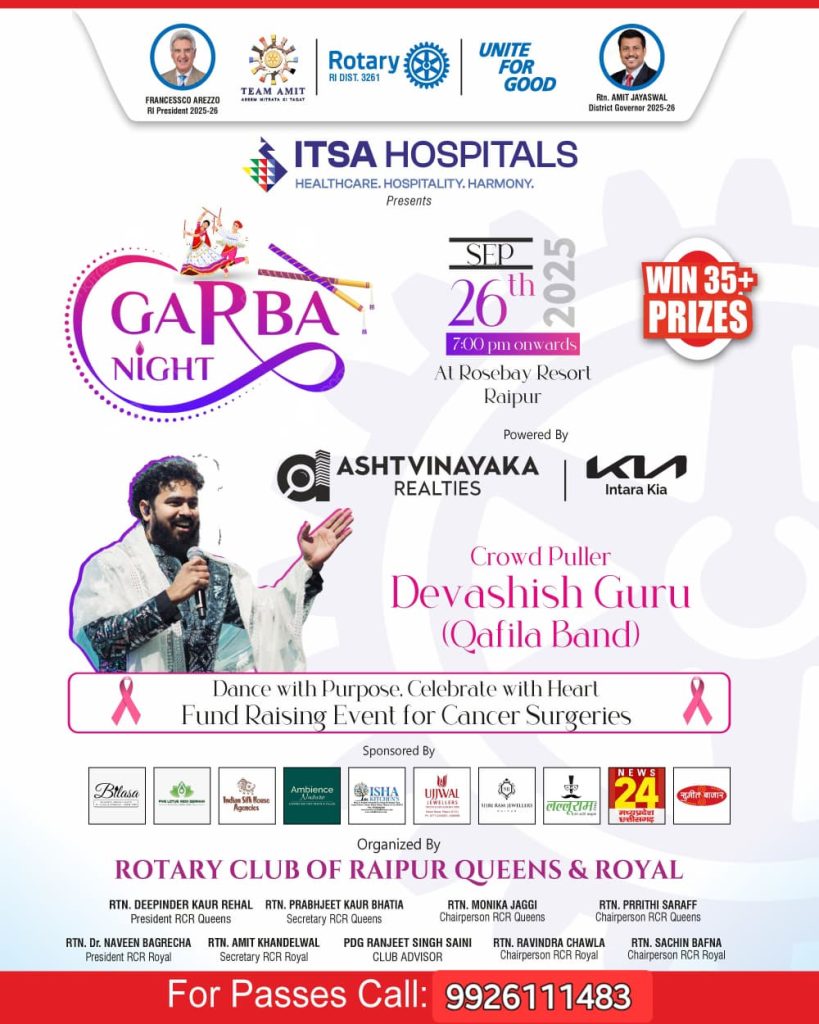 रायपुर. राजधानी के विधानसभा रोड स्थित रोजबे रिजॉर्ट में एक भव्य गरबा नाइट का आयोजन किया जा रहा है. इस भव्य गरबा नाइट का आयोजन रोटरी क्लब ऑफ रायपुर क्वींस एंड रॉयल द्वारा 26 सितंबर, 2025 को होने वाला है. इस कार्यक्रम में न्यूज 24 और लल्लूराम डॉट कॉम मीडिया पार्टनर है.