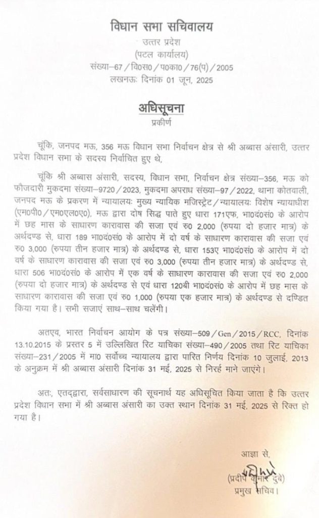 मऊ. उत्तर प्रदेश की मऊ विधानसभा सीट अब आधिकारिक रूप से रिक्त घोषित कर दी गई है. विधायक अब्बास अंसारी की सदस्यता को समाप्त करते हुए उत्तर प्रदेश विधानसभा सचिवालय ने रविवार को यह बड़ा फैसला लिया है. यह कार्रवाई न्यायालय के आदेश के अनुपालन में की गई है.