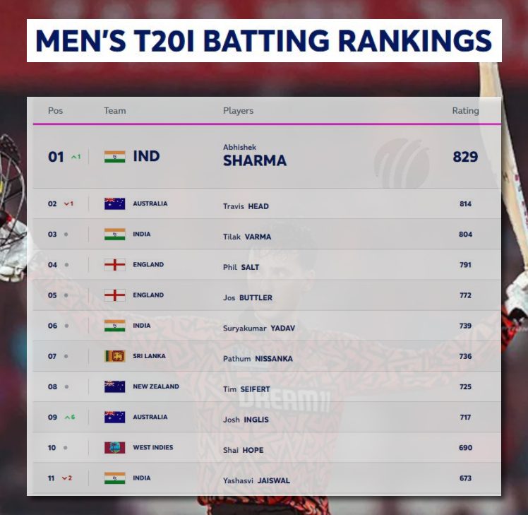 बता दें कि वेस्ट इंडीज के खिलाफ हाल ही में खत्म हुई टी20 सीरीज़ में ट्रेविस हेड के खराब प्रदर्शन की वजह से उन्हें एक पायदान का नुकसान झेलना पड़ा। भारत के लिए अब तक सिर्फ 17 टी-20 मैच खेलने वाले 24 साल के अभिषेक शर्मा के रेटिंग पॉइंट्स 829 हैं और ट्रेविस हेड 814 रेटिंग पॉइंट्स के साथ दूसरे स्थान पर हैं।