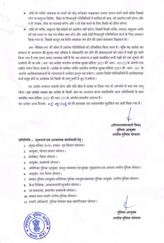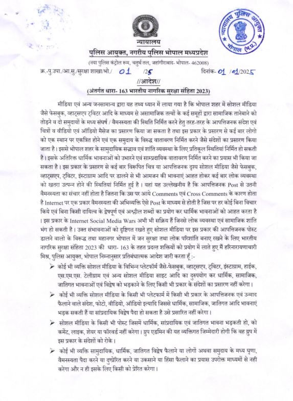 भारतीय नागरिक सुरक्षा संहिता 2023 की धारा 163 के अंतर्गत सोशल मीडिया संबंधित आदेश जारी किया गया है। यह आदेश मध्य प्रदेश के भोपाल पुलिस कमिश्नर हरिनारायणचारी मिश्र ने जारी किया है। जिसमें सोशल मीडिया पर धार्मिक भावना भड़काने पर कार्रवाई की बात कही गई है।