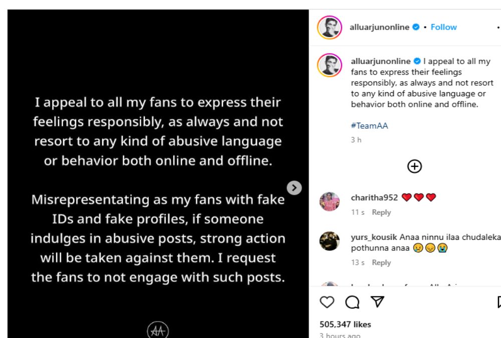 बता दें कि, इससे पहले अभिनेता अर्जुन ने सोशल मीडिया इंस्टाग्राम पर एक पोस्ट शेयर कर अपने सर्मथकों से अपील की थी कि वो ऑफलाइन या ऑनलाइन किसी के साथ अपमानजनक भाषा का इस्तेमाल न करें. तो वहीं कल उन्होंने पीसी कर बताया था कि उन्हें हैदराबाद के संध्या थिएटर में हुई दुर्घटना को लेकर दुख है. उन्होंने ये भी कहा था कि उनका चरित्र हनन करने की कोशिश की जा रही है. अल्लू ने अपने फैंस से भी सम्मान और पॉजिटीविटी बनाए रखने का आग्रह करते हुए अपने फॉलोअर्स से बेकार के कन्फ्लिक्ट को पैदा करने से बचने की रिक्वेस्ट की थी.