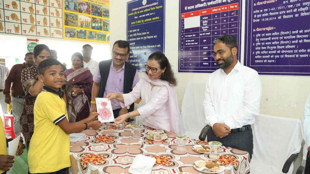 कांकेर प्रवास के दौरान भारत सरकार की अतिरिक्त सचिव सुश्री देशमुख ग्राम कोदाभाट स्थित शासकीय श्रवण एवं दृष्टि बाधितार्थ विशेष विद्यालय भी पहुंचीं. यहां विशेष आवश्यकता वाले दिव्यांग विद्यार्थियों ने साइन लैंग्वेज से उनका स्वागत किया. इस दौरान दिव्यांग बच्चों ने स्वागत गीत गाया तथा खुद के द्वारा तैयार की गई पेंटिंग्स उन्हें भेंट की. यह विशेष विद्यालय 50 सीटर है.