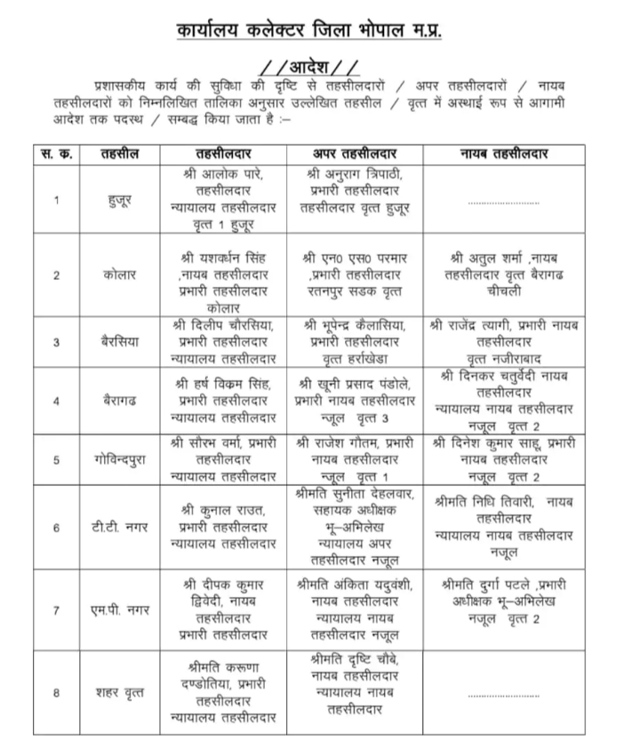 शिखिल ब्यौहार, भोपाल। राजधानी भोपाल में कलेक्टर कौशलेंद्र विक्रम सिंह ने 11 तहसीलदार और 11 नायब तहसीलदारों में काम का बंटवारा करते हुए उन्हें इधर से उधर किया है। एमपी नगर में दीपक कुमार द्विवेदी तहसीलदार और अंकिता यदुवंशी को अपर तहसीलदार की जिम्मेदारी दी गई है। वहीं, शहर वृत्त में तहसीलदार करुणा कंडोतिया और अपर तहसीलदार दृष्टि चौबे की पोस्टिंग की गई है। दंडोतिया अब तक बैरसिया में पदस्थ थीं। वहीं रायसेन से ट्रांसफर होकर भोपाल आए हर्ष विक्रम सिंह की बैरागढ़ में पोस्टिंग की गई है। वहीं, आलोक पारे को हुजूर और दिलीप चौरसिया को बैरसिया भेजा गया है।