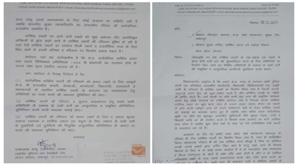अतः निवेदन है कि सभी शासकीय कार्यालयों, विद्यालयों और न्यायालयों लोक परिसरों में विभिन्न धर्मो, पंथों और संप्रदायों के धार्मिक स्थल स्थापित किए जाने के लिए उचित निर्देश जारी करने की कृपा करें। साथ ही वर्तमान में स्थापित धार्मिक स्थलों पर समाज के सभी वर्गों के लोगों को पुजारी और पुरोहित नियुक्त्ति हेतु उनके जनसंख्या के अनुपात में प्रतिनिधित्व के सिद्धांत पर अवसर देने की कृपा करें। लेटर के आखिर में कहा गया है कि यदि यह मांग पूरी करना संभव न हो तो किसी विशेष धर्म के धार्मिक स्थल को शासकीय कार्यालयों, विद्यालयों और न्यायालयों परिसरों से हटाए जाने के लिए उचित निर्देश जारी करने की कृपा करें। जिससे कि संविधान के मूलभूत ढांचे की धर्मनिर्पेक्ष भावना का परिपालन हो सके। इस पत्र की प्रतिलिपियां गोंडवाना गणतंत्र पार्टी, बहुजन समाज पार्टी, आजाद समाज पार्टी, बामसेफ, पिछड़ा समाज पार्टी यूनाईटेड और जय आदिवासी युवा शक्ति (जयश) पार्टी इंदौर को भी भेजी गई हैं।